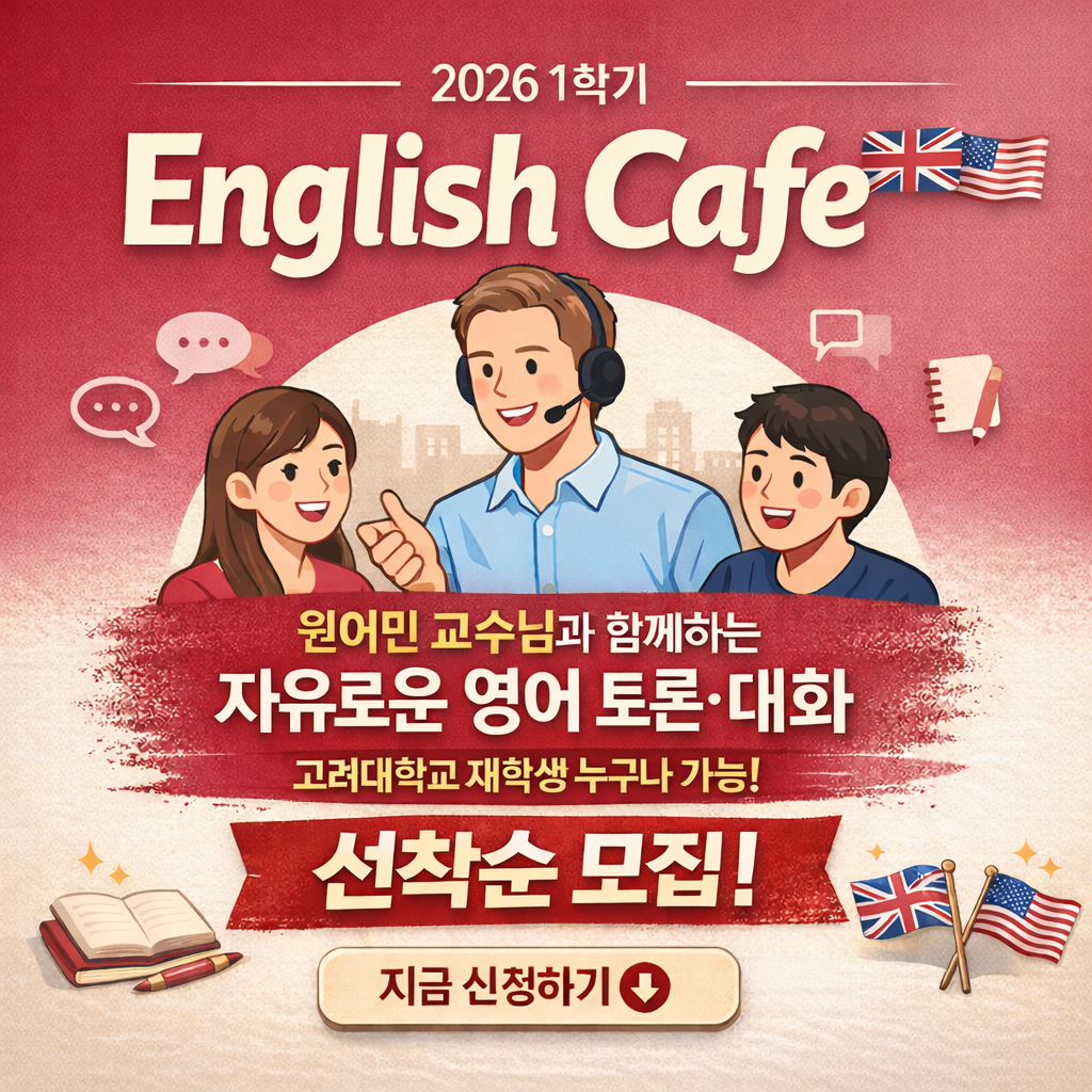 원어민 교수님과 함께 영어로 자유롭게 이야기할 수 있는 English Cafe가 2026년 1학기에도 운영됩니다!