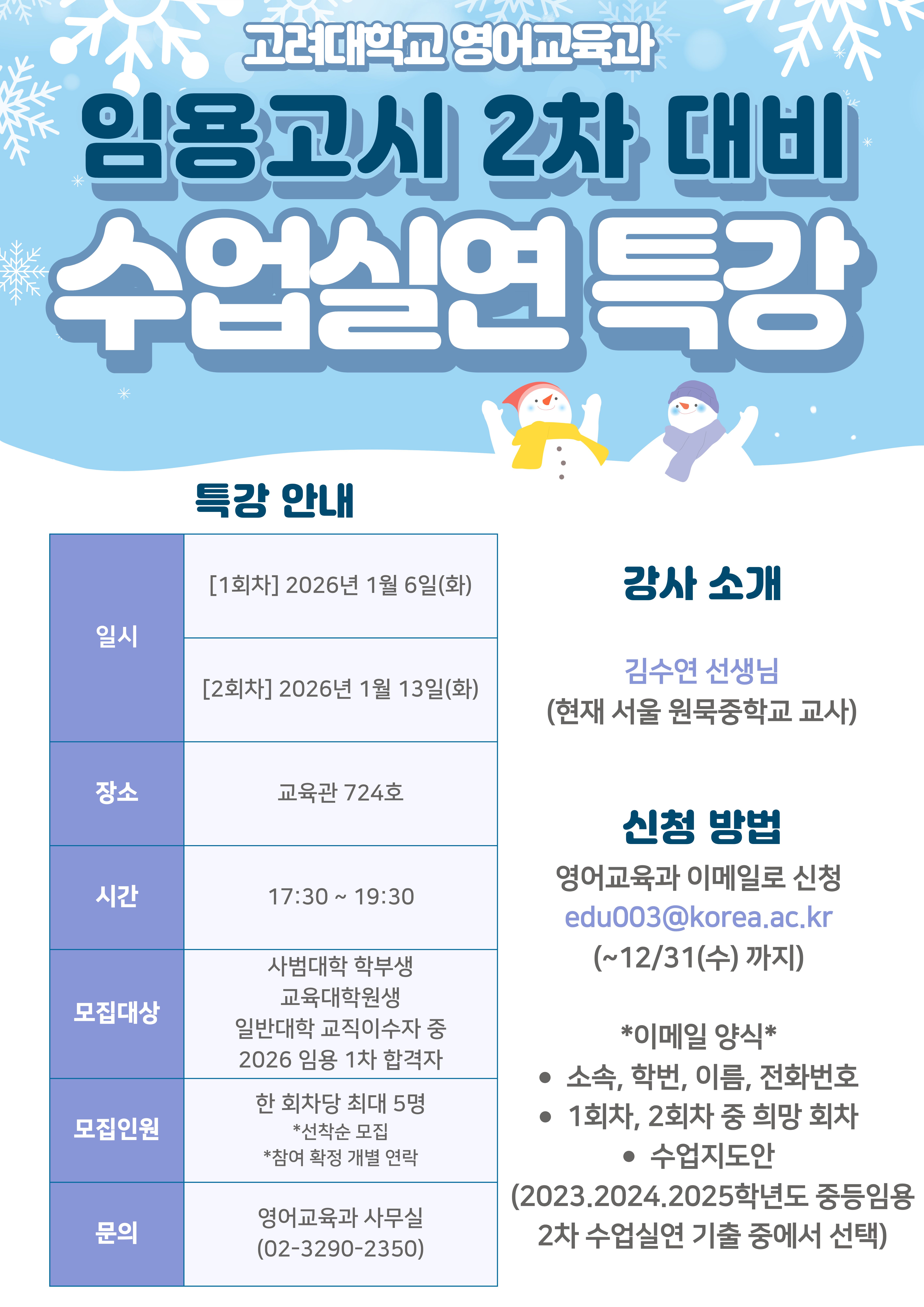 아래와 같이 2026 임용고시 2차 대비 수업실연 특강을 진행하오니 많은 참여 바랍니다.